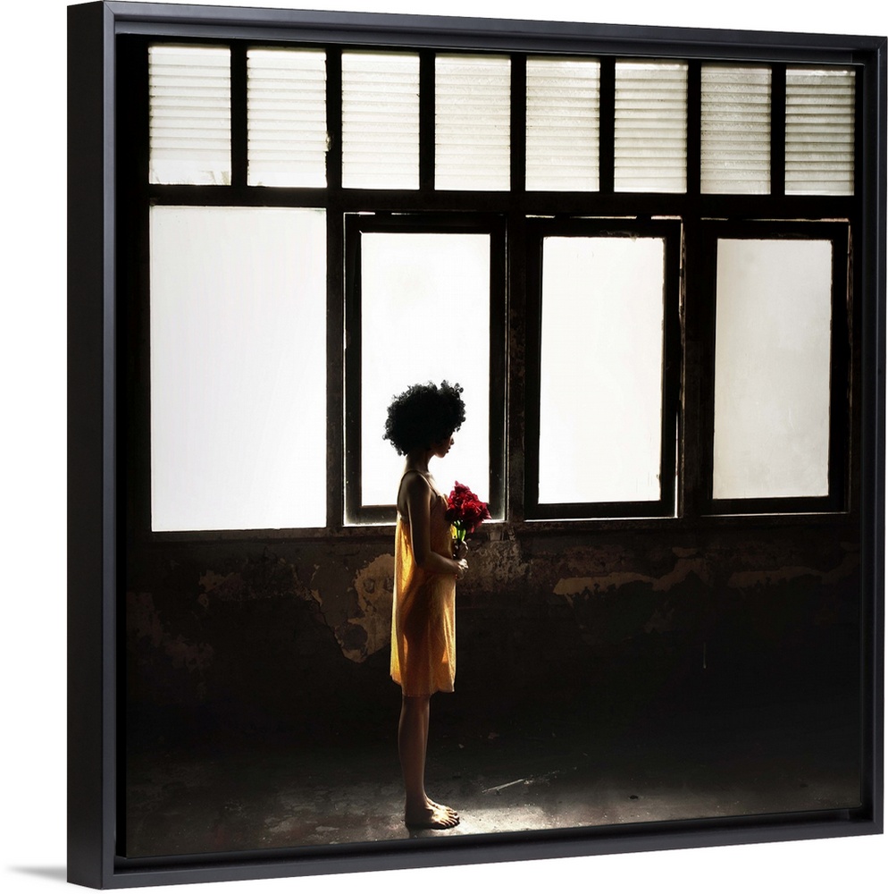 <p>A woman in a yellow robe holding a bouquet of red flowers in front of windows in an old room.</p>