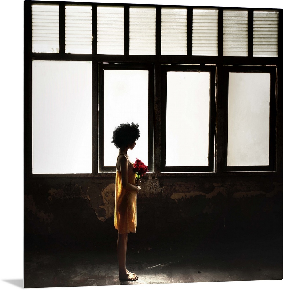 <p>A woman in a yellow robe holding a bouquet of red flowers in front of windows in an old room.</p>