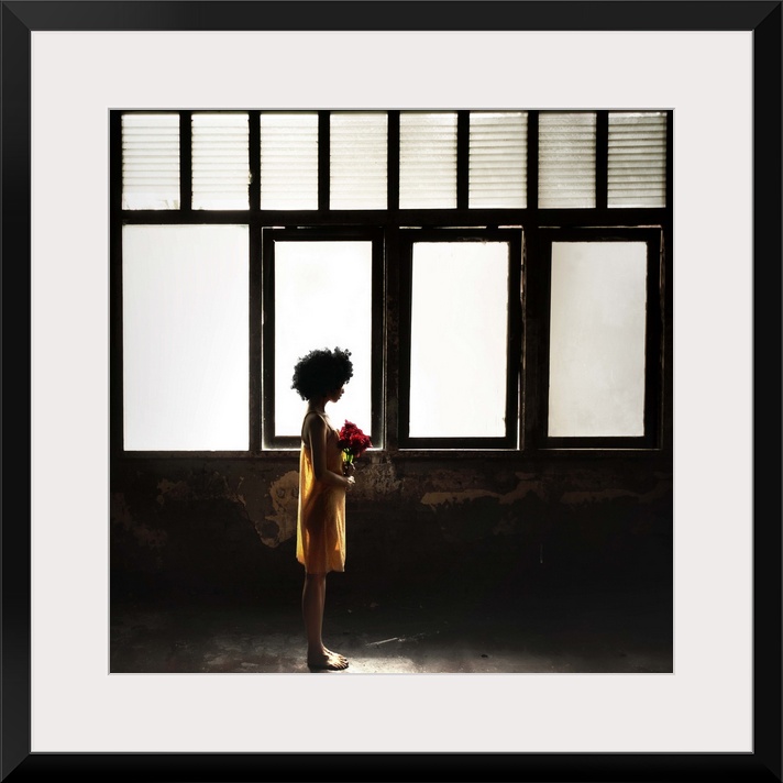 <p>A woman in a yellow robe holding a bouquet of red flowers in front of windows in an old room.</p>