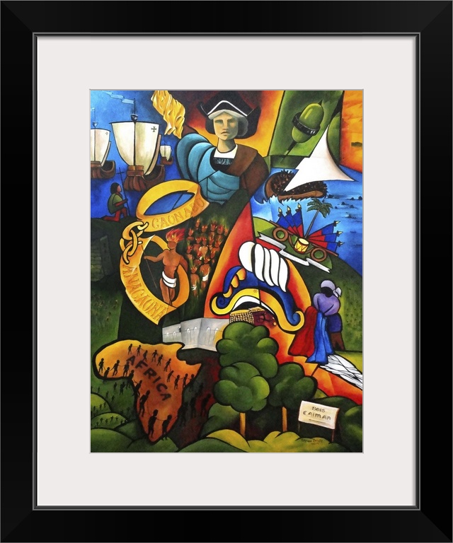 <p>Contemporary painting featuring elements of history including Christopher Columbus and African slaves.</p>