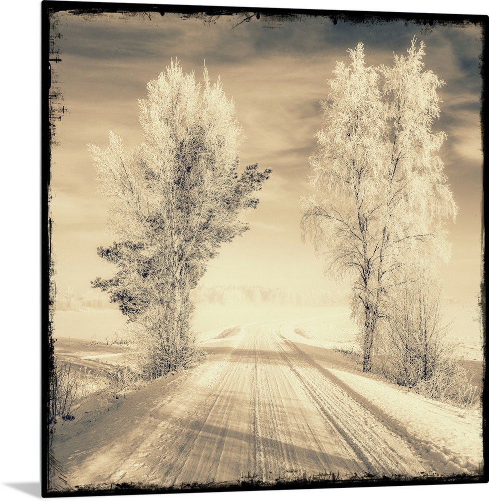<p>Snow-covered path passing between two trees with a sepia tone</p>