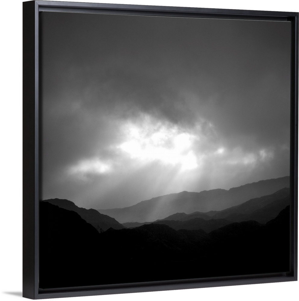 <p>An uplifting monochromatic image of God's Crepuscular Rays bursting through clouds over silhoutted muntains.</p>
