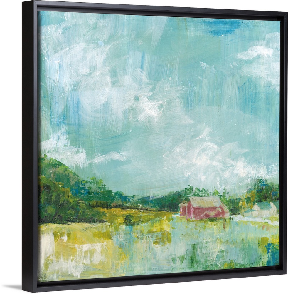 <p>Contemporary landscape painting on a square background with a red barn and open fields surrounded by rolling hills.</p>