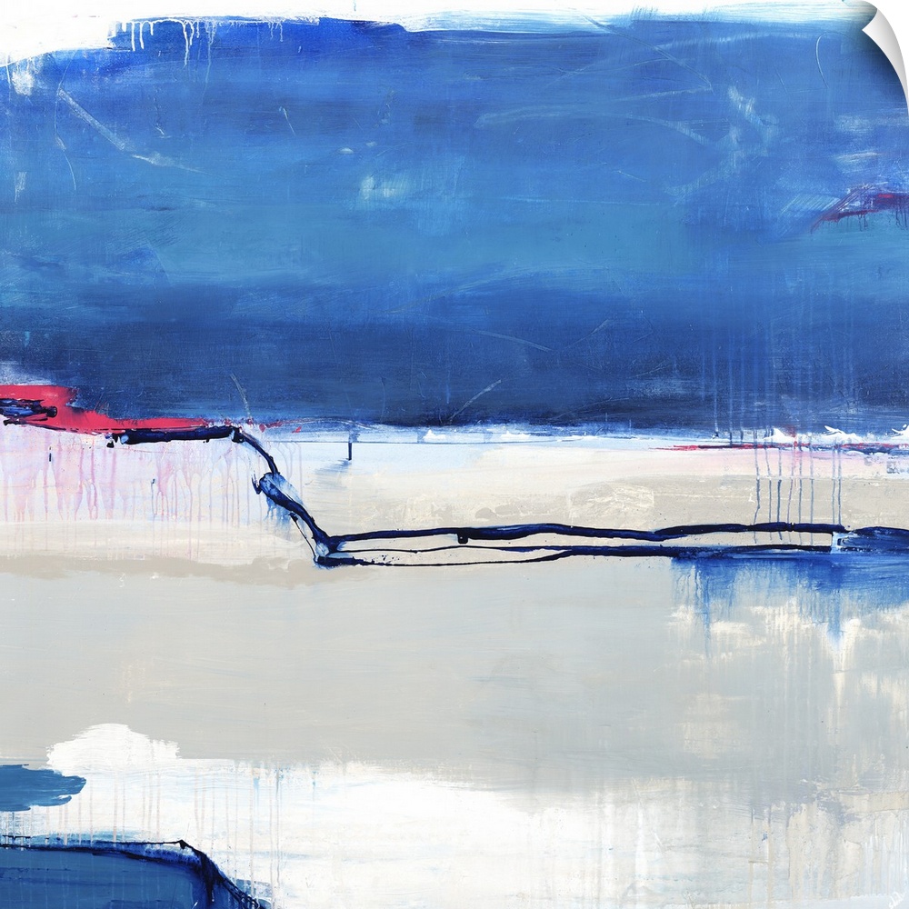 <p>Square abstract artwork with sections of blue and gray and thin line work in the center in blue and pink with faint paint drips.</p>