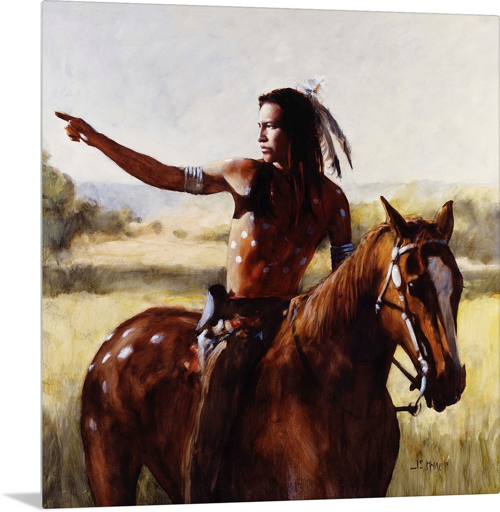 <p>Contemporary western theme painting of a native American man on horseback pointing to something in the distance.</p>