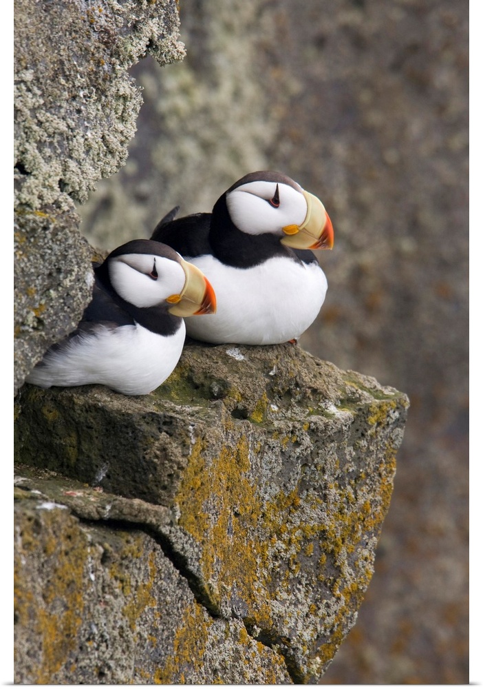 <p>Horned Puffin pair perched on a cliff ledge during Summer, Saint Paul Island, Pribilof Islands, Bering Sea, Southwest Alaska</p>