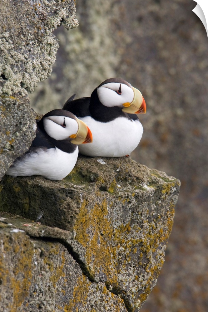<p>Horned Puffin pair perched on a cliff ledge during Summer, Saint Paul Island, Pribilof Islands, Bering Sea, Southwest Alaska</p>