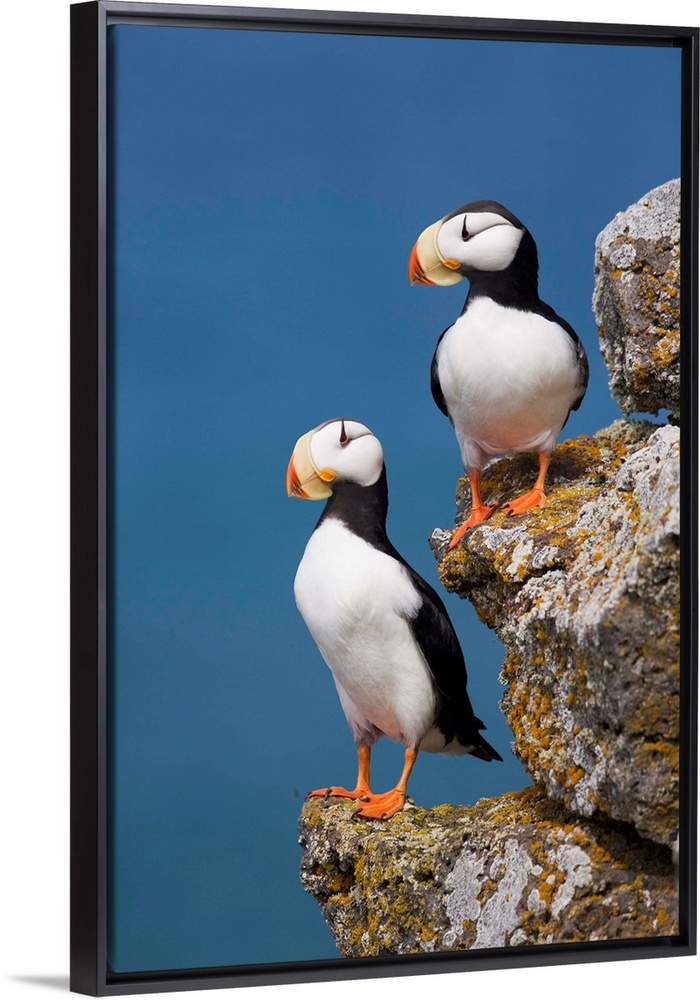 <p>Horned Puffin pair perched on rock ledge with the blue Bering Sea in background, Saint Paul Island, Pribilof Islands, Bering Sea, Southwest Alaska</p>