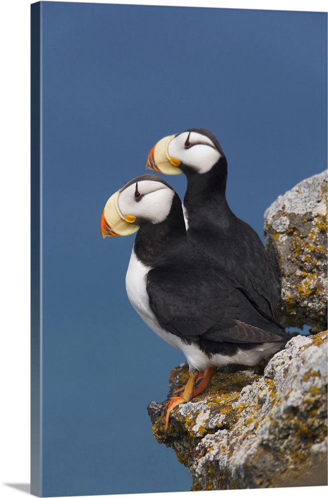 <p>Horned Puffin Pair, One Yawning, Perched On Rock Ledge With The Blue Bering Sea In Background, Saint Paul Island, Pribilof Islands, Bering Sea, Southwest Alaska</p>