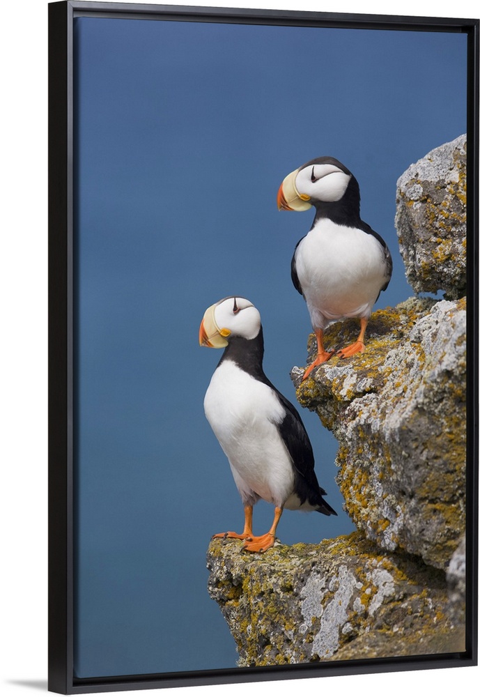 <p>Horned Puffin Pair Perched On Rock Ledge With The Blue Bering Sea In Background, Saint Paul Island, Pribilof Islands, Bering Sea, Southwest Alaska</p>
