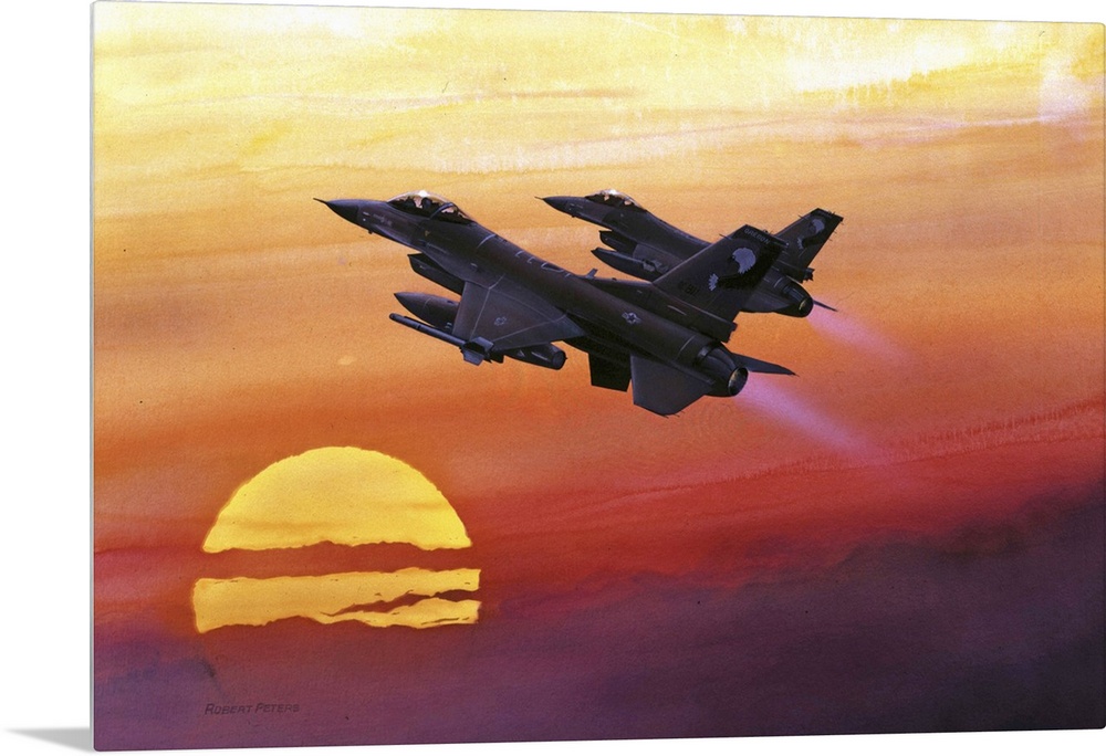 <p>Contemporary artwork featuring F-16 Fighting Falcons flying upwards against a bold, warm sunset.</p>