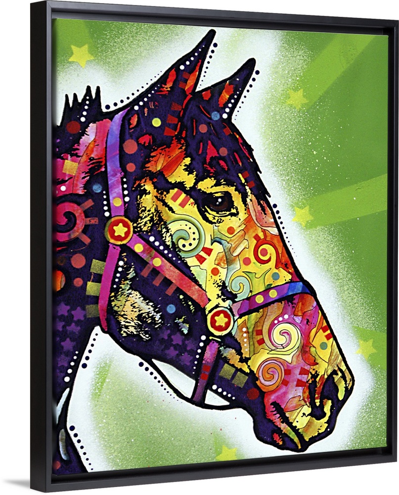 <p>Large vertical artwork of the profile of a horses head, filled in with multicolored graffiti art and various shapes. The head is surrounded by small stars that beam outward from a light border that appears spray painted.</p>