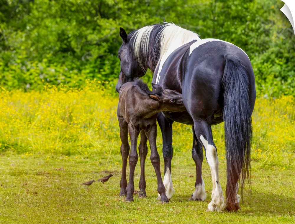 <p>Horse and foal standing together in a pasture; Saskatchewan, Canada</p>
