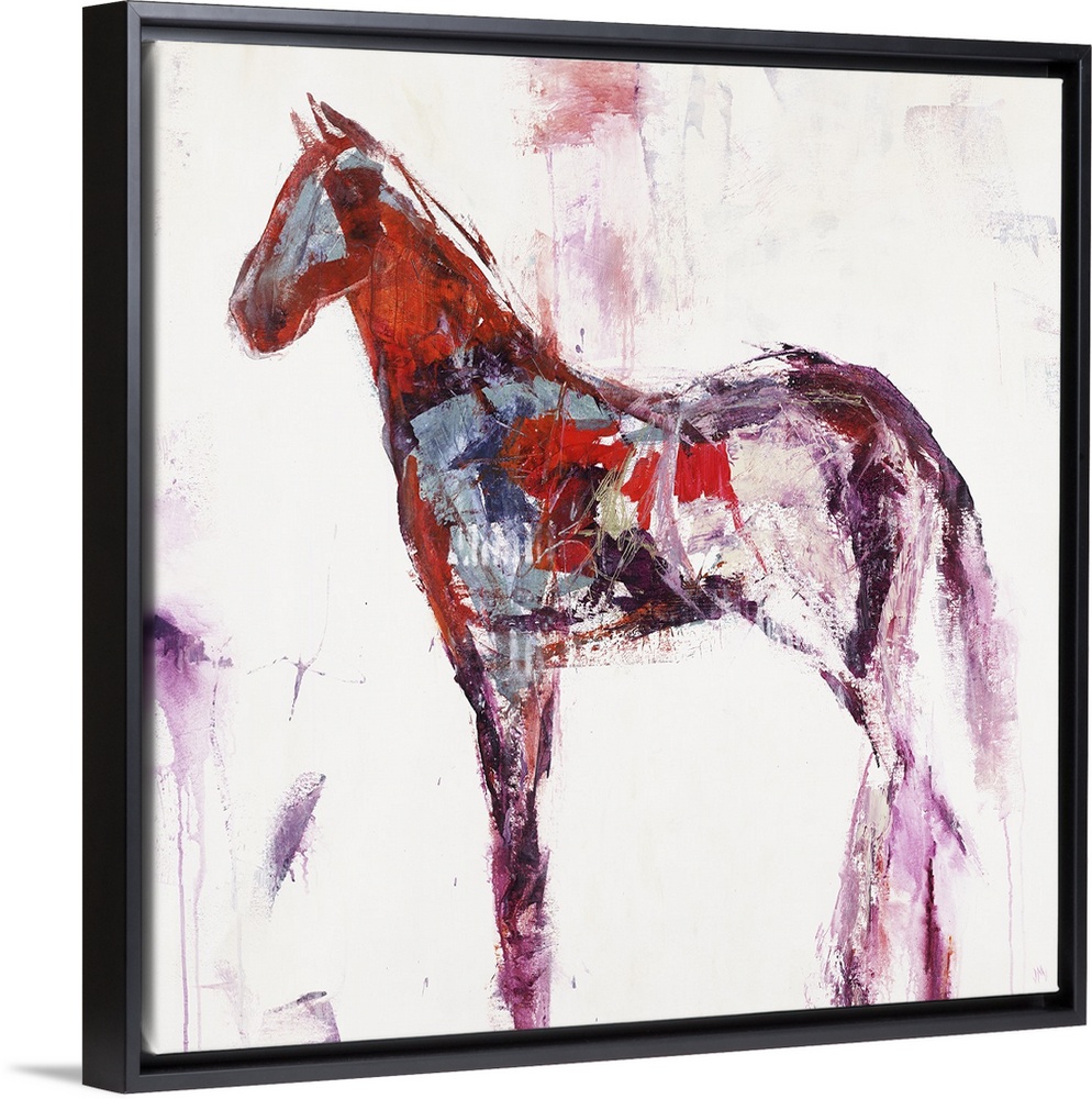 <p>An abstract painting in the form of a horse using bold brush strokes of warm colors of red, magenta and blues.</p>