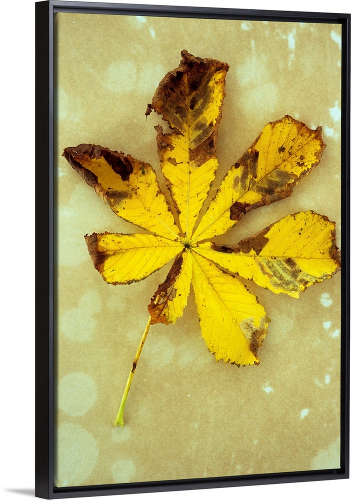 <p>Yellow and brown autumn leaf of Horse chestnut or Aesculus hippocastanum tree lying on antique paper</p>