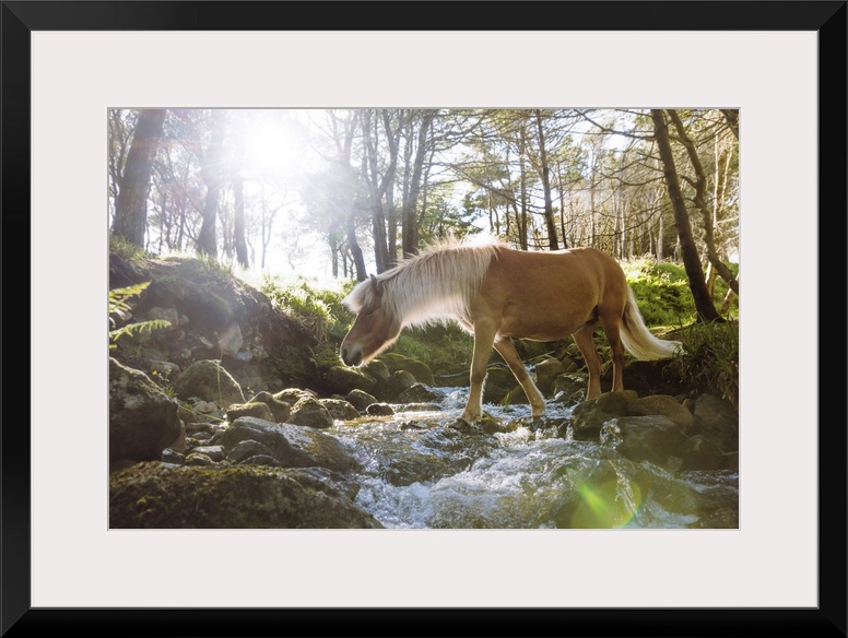 <p>A Faroese horse crossing a river in a wood in the village of Trongisvagur. Island of Suduroy. Faroe Islands.</p>