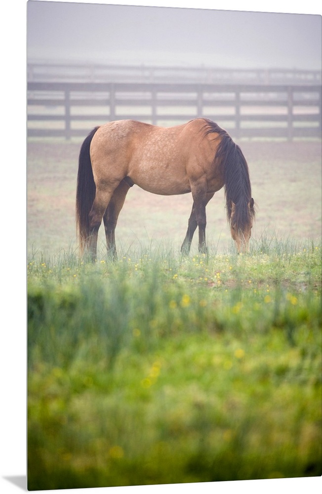 <p>Horse grazes in mist near fence, Powhatan, Virginia, United States.</p>