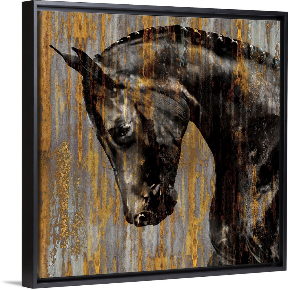 <p>Square decor of a black stallion with its head down on a silver background and gold streaks running over the top.</p>