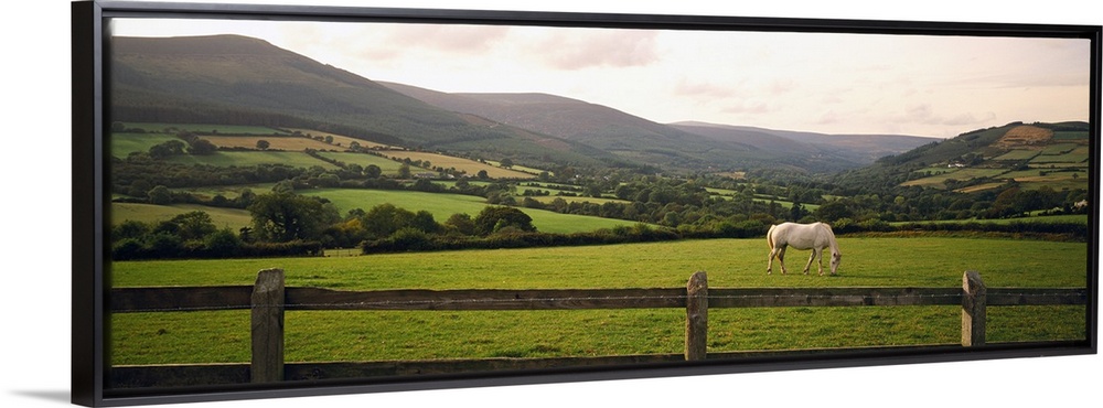 <p>Big canvas photo of a horse grazing in a field with a fence in the foreground and rolling mountains in the distance.</p>