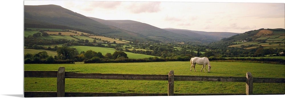 <p>Big canvas photo of a horse grazing in a field with a fence in the foreground and rolling mountains in the distance.</p>