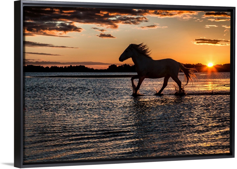 <p>Horse in silhouette running in the ocean in France.</p>