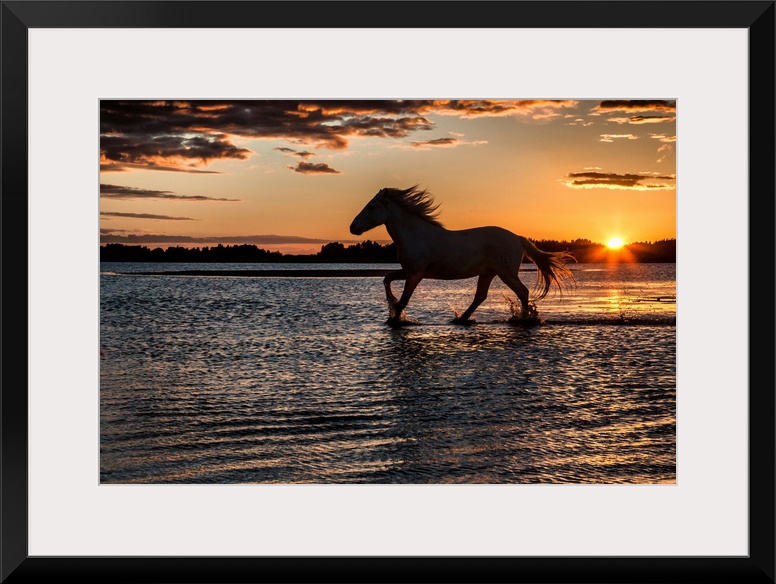 <p>Horse in silhouette running in the ocean in France.</p>