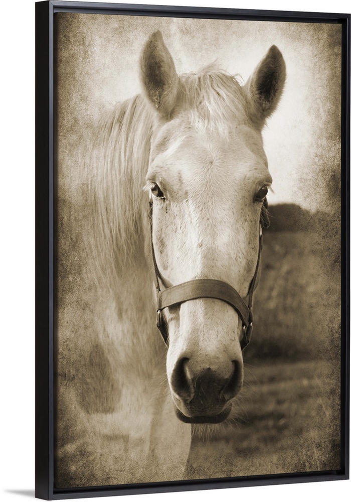 <p>Sepia toned photograph of a white horse wearing a bridle, standing in a field</p>