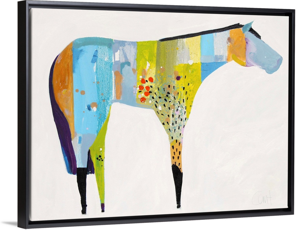 <p>A contemporary painting of a multi-colored horse against a white background.</p>
