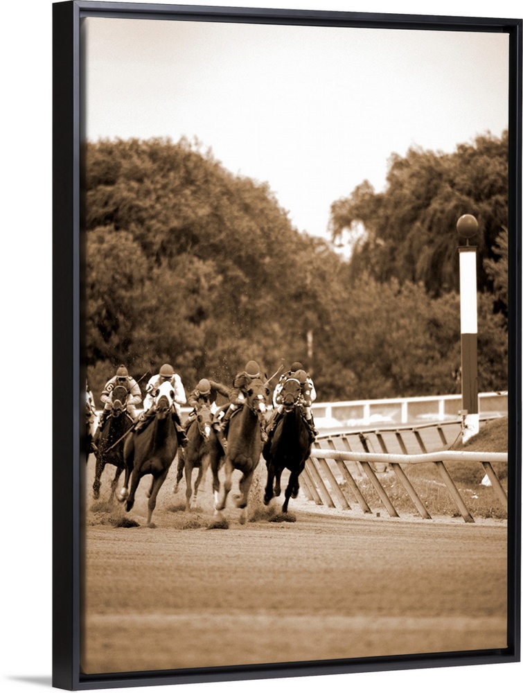 <p>Arlington Park Group of thoroughbred horses comming out of the turn.</p>