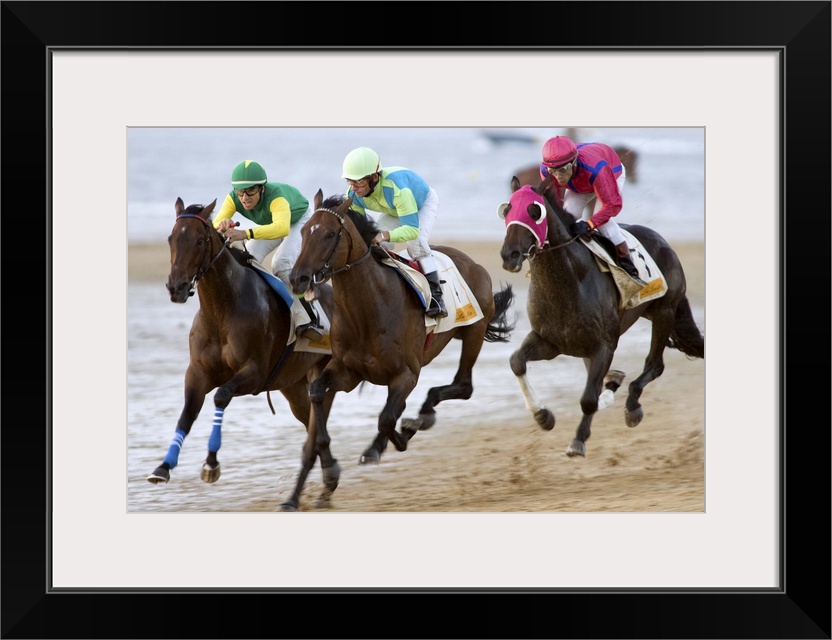 <p>Thoroughbred horses compete at sea shore with green horizon of ?Doana National Park? and the whole seafront in Sanlucar de Barrameda, Cadiz, Spain. The races date back to the 19th century.</p>
