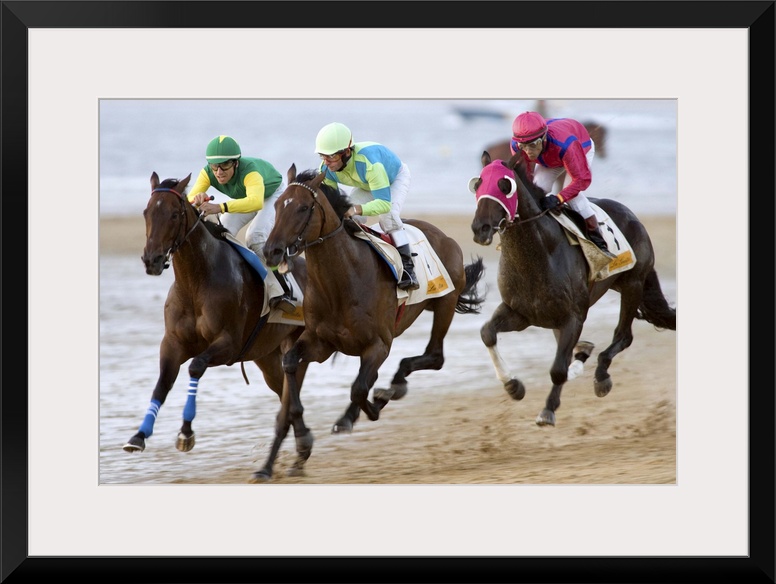 <p>Thoroughbred horses compete at sea shore with green horizon of ?Doana National Park? and the whole seafront in Sanlucar de Barrameda, Cadiz, Spain. The races date back to the 19th century.</p>