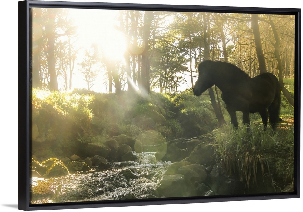 <p>A Faroese horse standing in front of a river in a wood in the village of Trongisvagur. Island of Suduroy. Faroe Islands.</p>