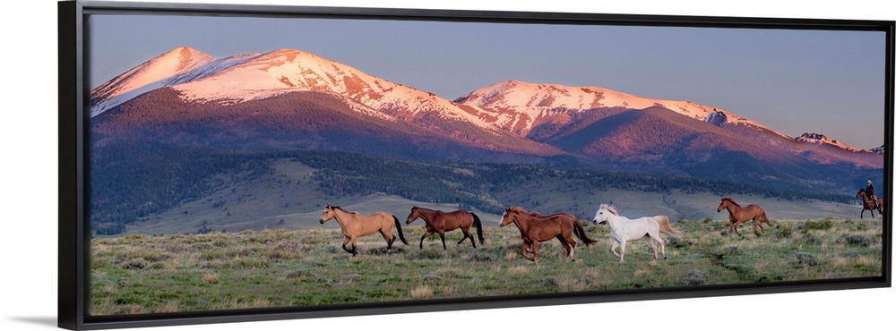 <p>Photograph of wild horses galloping in a field with snow capped mountains in the background at sunset.</p>