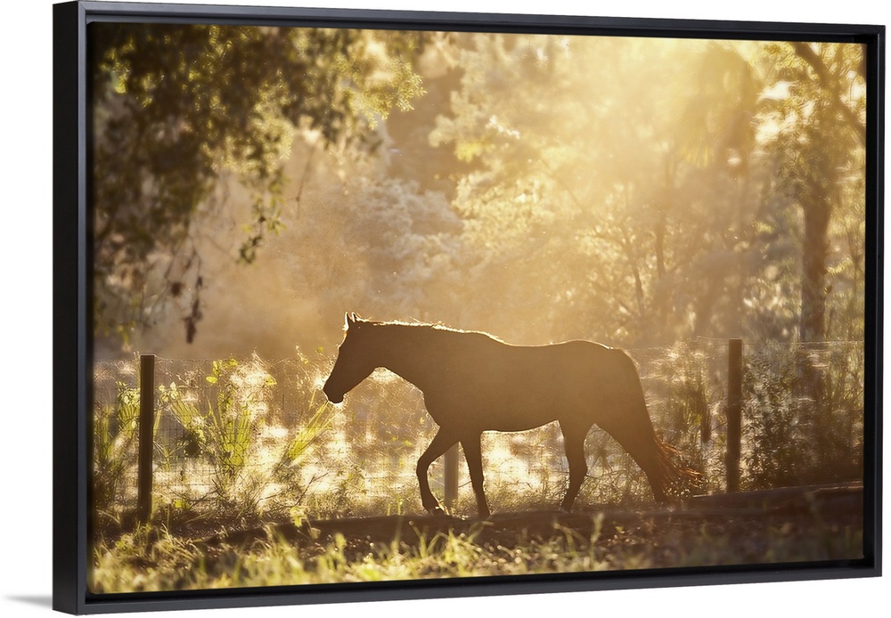 <p>Horse underneath canopy of trees in forest or woods running along fence, backlit by sunset.</p>