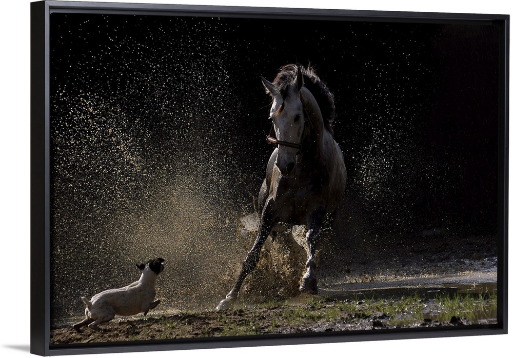 <p>A small dog chases a horse, kicking up dust and dirt.</p>