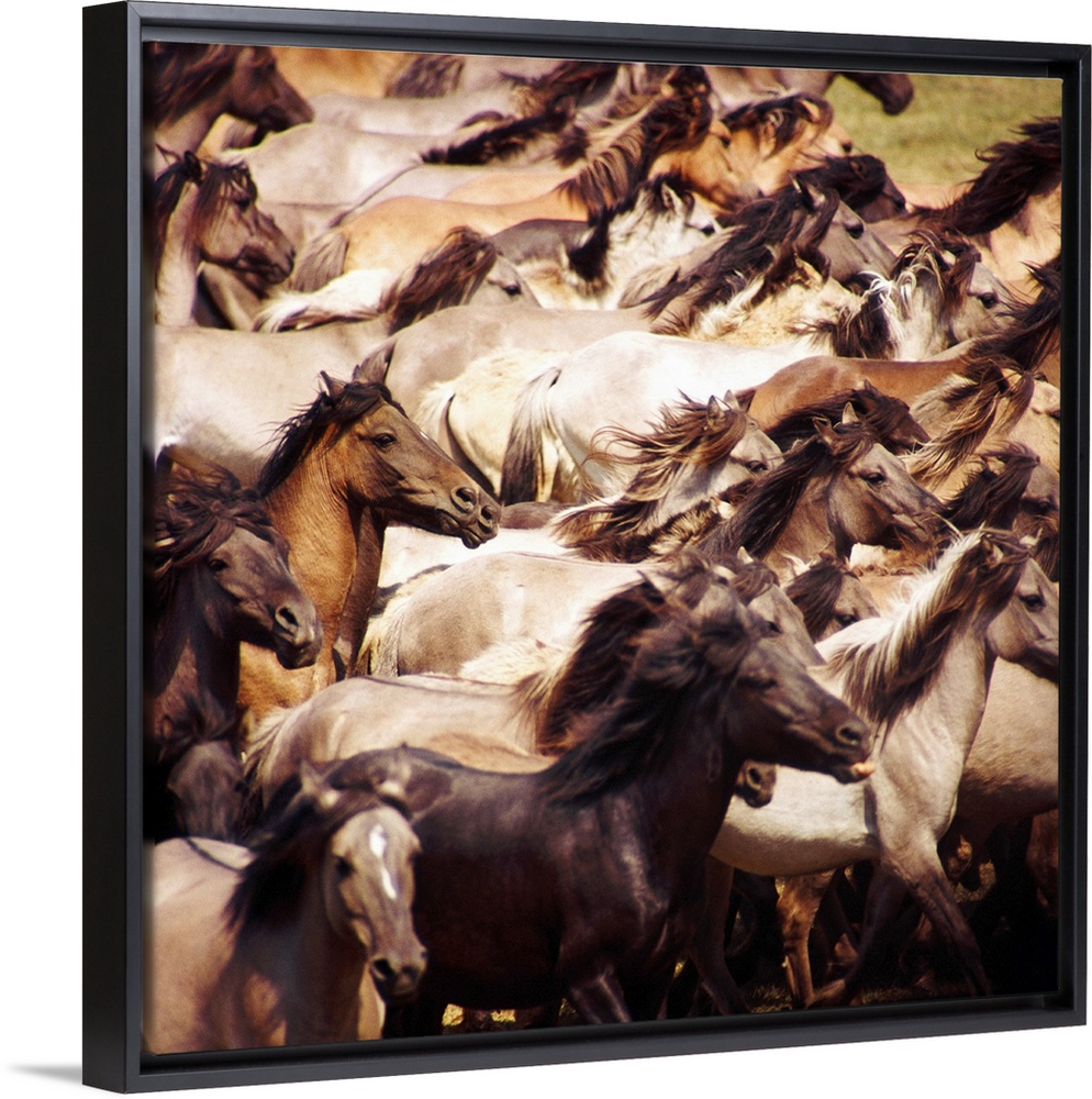 <p>Square photo on canvas of a up close view of a herd of horses running in a field.</p>
