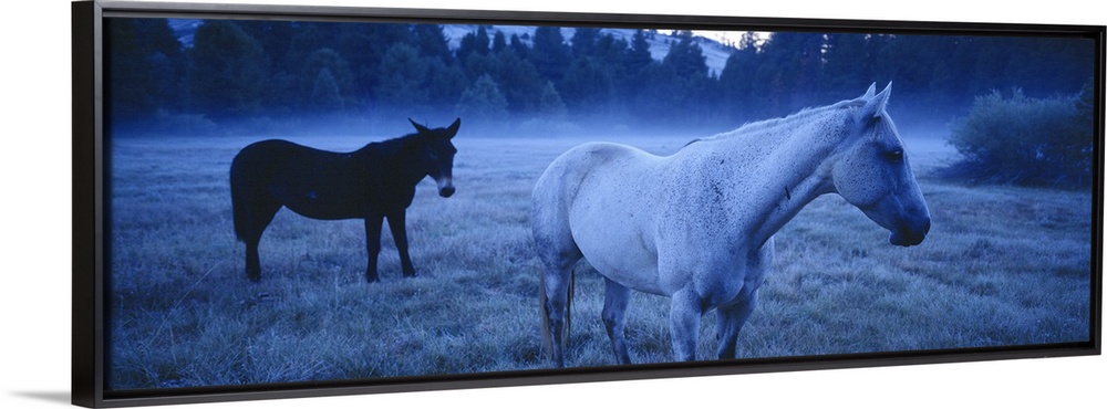 <p>Oversized, landscape photograph of a horse and a donkey standing in a lightly foggy field just before sunrise, a line of trees in the background.</p>