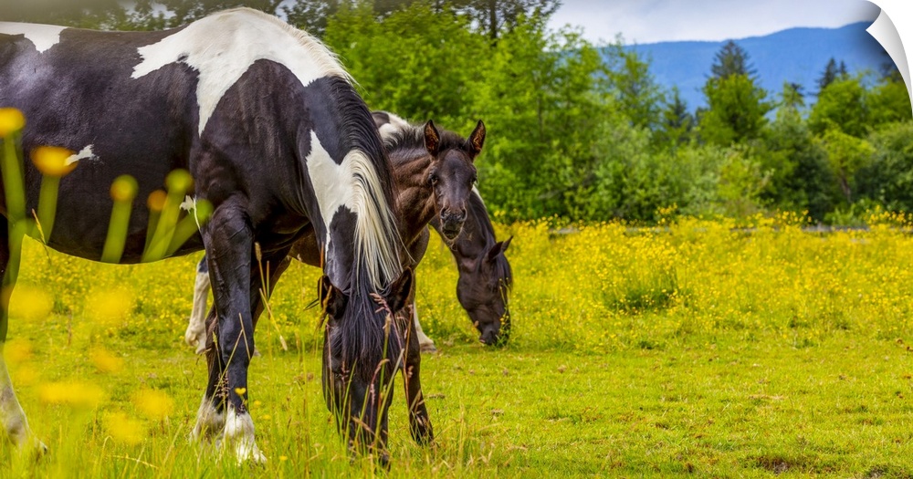 <p>Horses and foal standing together in a pasture; Saskatchewan, Canada</p>