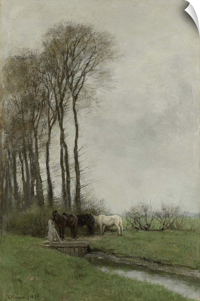 <p>Horses at the Gate, by Anton Mauve, 1878, Dutch painting, oil on canvas. Three horses standing at a sluice in a water filled ditch.</p>