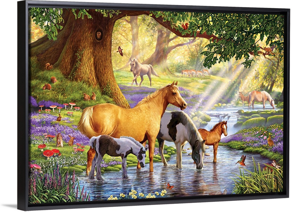 <p>Family of Horses including two foals in a stream in the sunlit woods with other animals including a kingfisher, owl, rabbits, deer and squirrels.</p>