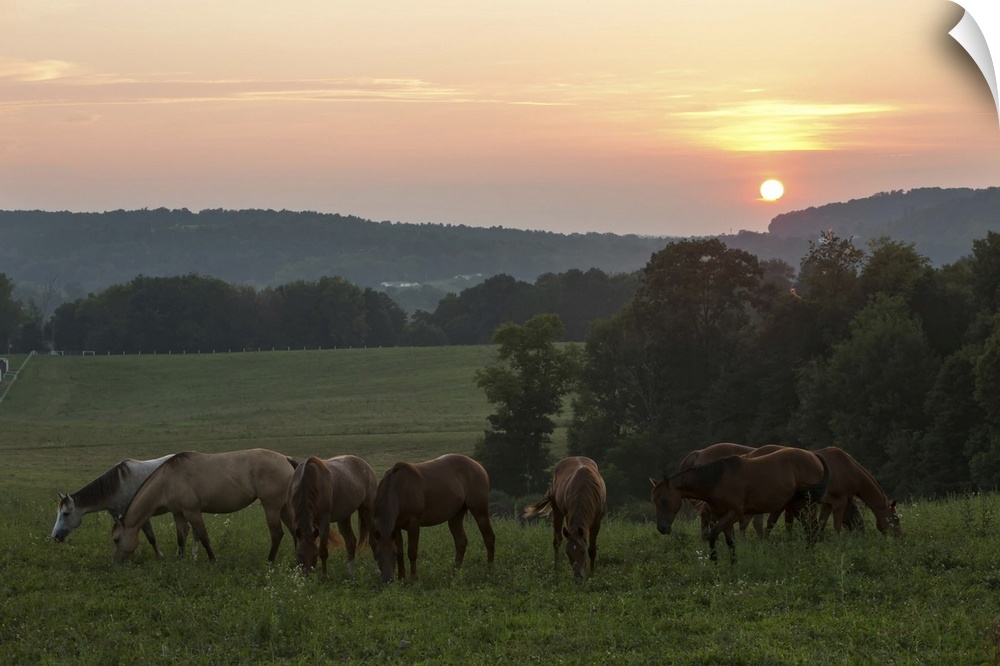 <p>Horses graze on grass at sunset in rural farmland. Millersburg, Ohio</p>