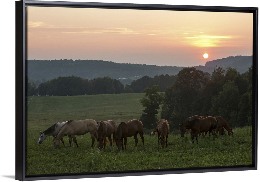<p>Horses graze on grass at sunset in rural farmland. Millersburg, Ohio</p>