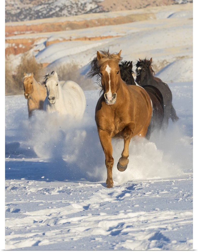 <p>Cowboy horse drive on Hideout Ranch, Shell, Wyoming. Herd of horses running in snow.</p>
