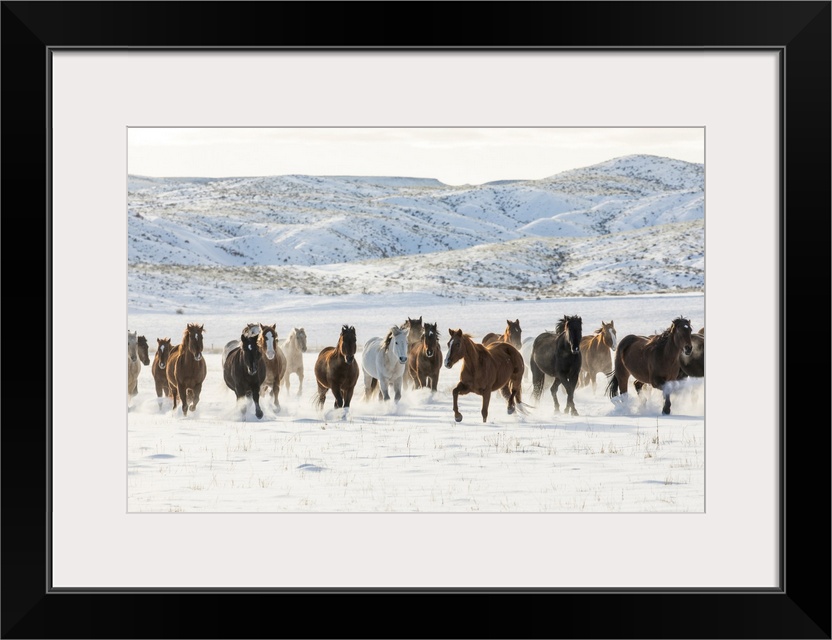 <p>Cowboy horse drive on Hideout Ranch, Shell, Wyoming. Herd of horses running in snow.</p>
