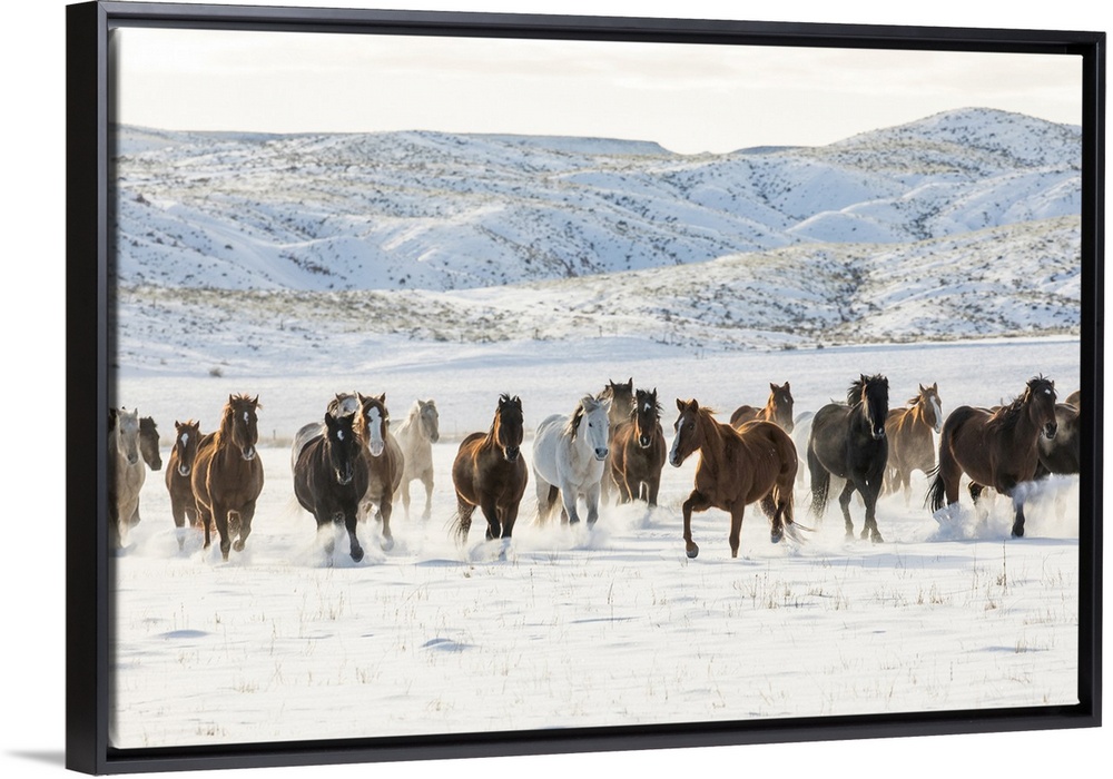 <p>Cowboy horse drive on Hideout Ranch, Shell, Wyoming. Herd of horses running in snow.</p>