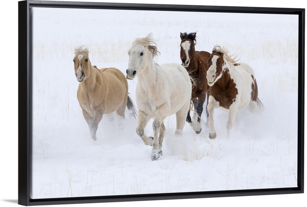 <p>Cowboy horse drive on Hideout Ranch, Shell, Wyoming. Herd of horses running in snow.</p>