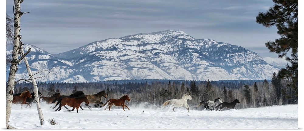 <p>Horses running in the snow on a ranch in winter, Montana, United States of America.</p>