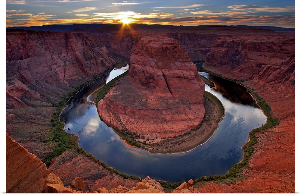 <p>Photograph of river circling huge rock formation at sunset under a cloudy sky.</p>