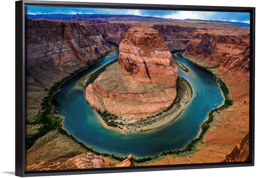 <p>Horseshoe Bend section of the Colorado River with partly cloudy skies and rain in the distance.</p>