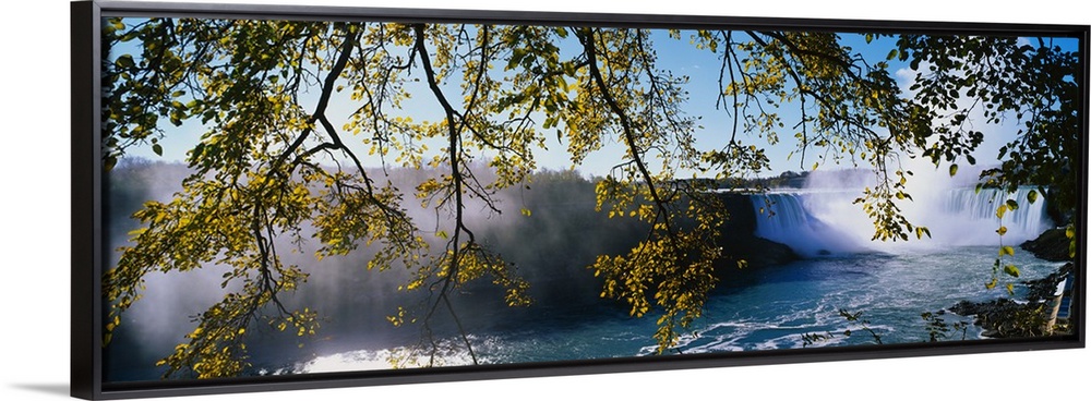 <p>Panoramic photograph taken of Niagara Falls through low hanging tree branches that stretch across the picture.</p>